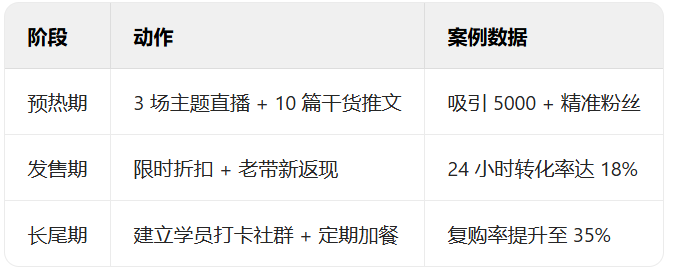 ·MVP(最小可行性产品)测试:先推出 99 元《7 天极速减脂体验营》,根据学员反馈优化后再升级为高价课;