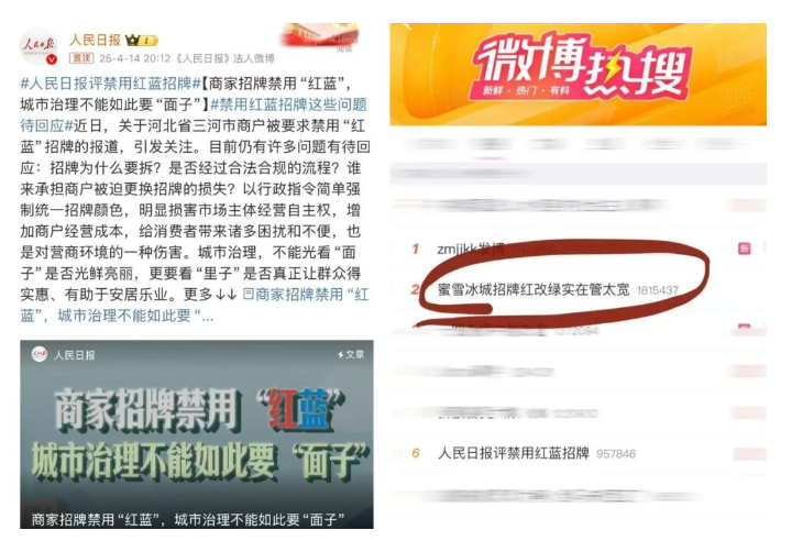 4月10日,有门店连夜把招牌改回了红色;4月14日,人民日报发文批评城市管理“只讲面子”,侵犯商家自主经营;