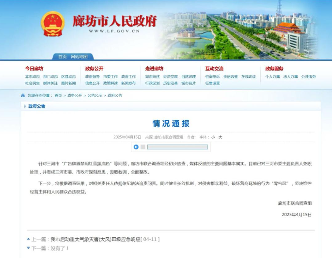 4月15日,官方通报:三河市委主要负责人被免职,同时要求深刻反思、彻底整改。