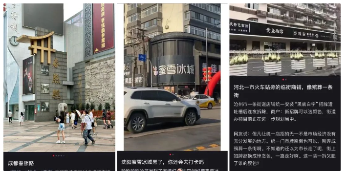 - 沈阳、沧州也都出现过统一黑白招牌的操作,结果引发大量网友吐槽“走在街上像灵堂”。