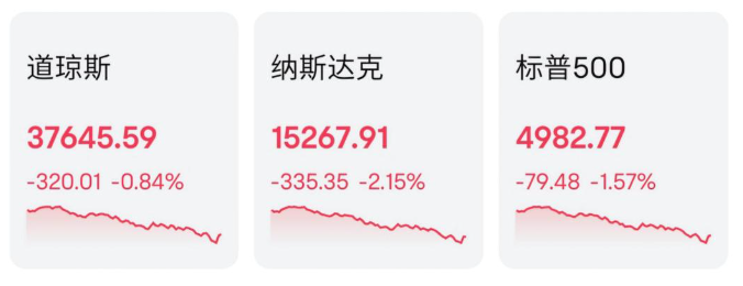 最终收盘数据显示,三大股指全线收跌,科技股普遍跳水。苹果暴跌近7%,特斯拉重挫超6%,英伟达由涨转跌,最终收跌逾3%。