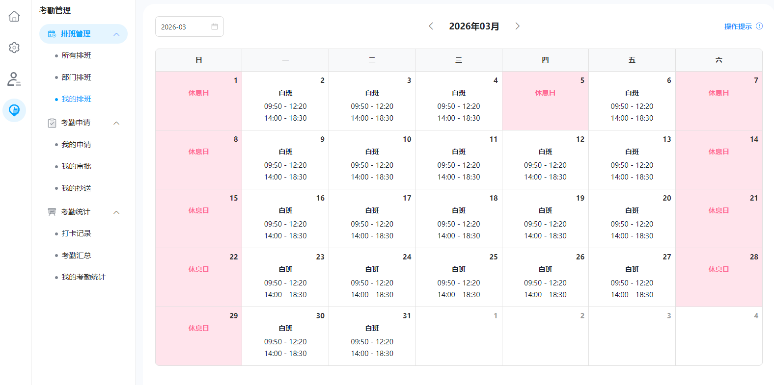 1、支持多班次、多部门、个人排班,日历视图一目了然,临时调班一键操作,彻底告别Excel排班。解决了排班复杂,调班难的问题。
