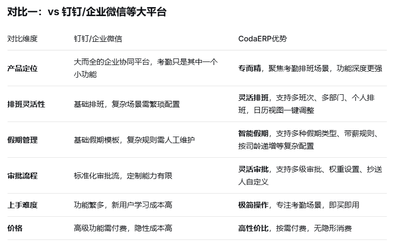 1、vs 钉钉/企业微信:CodaERP更专注考勤排班场景,功能更深、操作更简单。在排班灵活性、假期复杂配置、审批流程定制等方面更具优势,且性价比更高,无隐形消费。