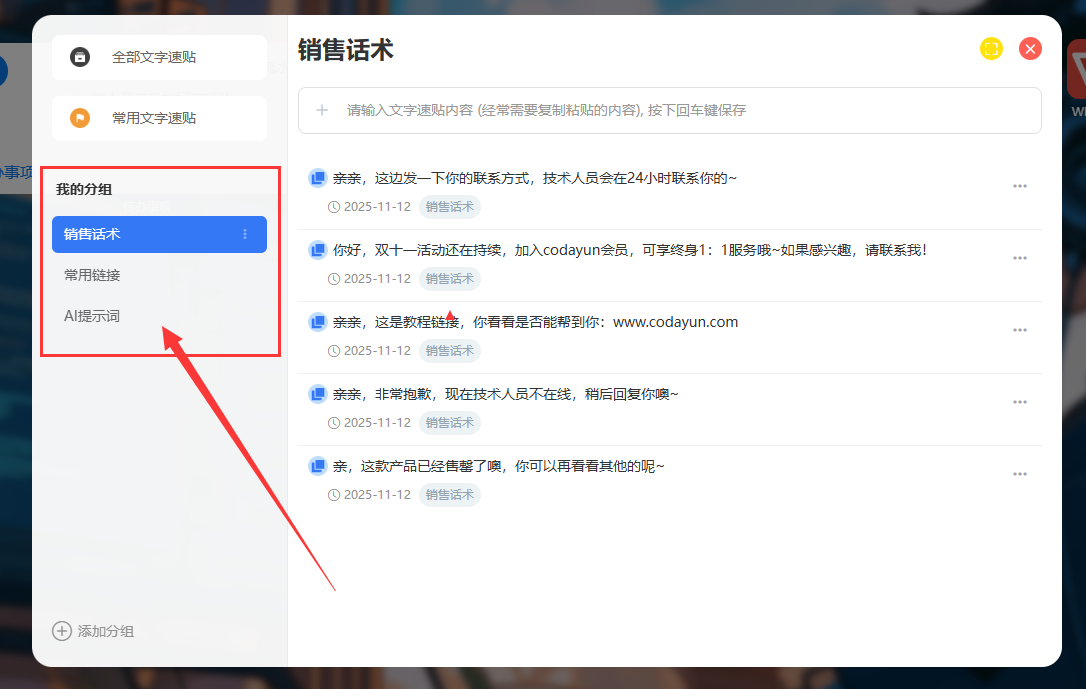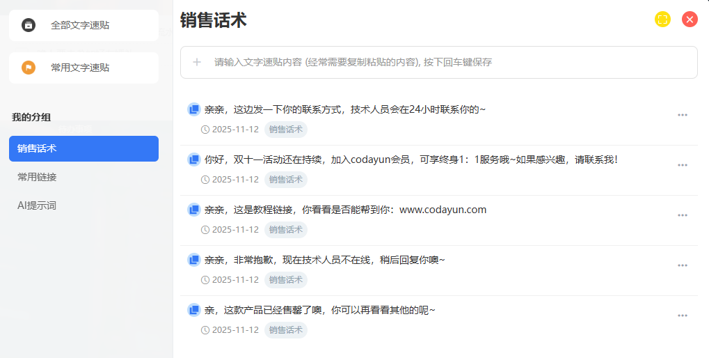 你每天是不是都在反复复制客户信息、会议链接、账号密码? 这款工具是内置于CodaYun云端系统里面的,打开(www.codayun.com)后,在底部应用台中点击【粘贴板工具】,就可以直接上手使用。 1、如果你是做销售的,那么你可以把这里当成你的话术保存工具。客户问价格、要方案、提疑问,你都可以提前整理好各类话术,用到的时候一键复制,直接发送。 工具链接直达:CodaYun