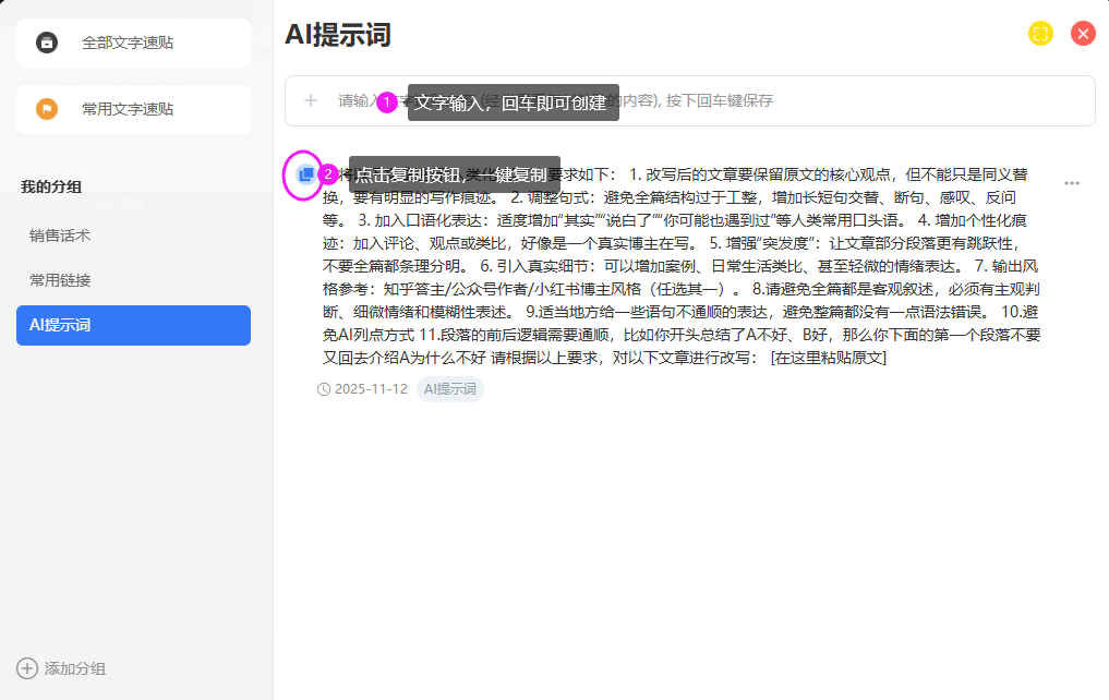 4、它的操作也非常的简单。在输入框里面直接粘贴你的文字内容,回车即创建完成,然后点击左侧的按钮就可以实现复制了。