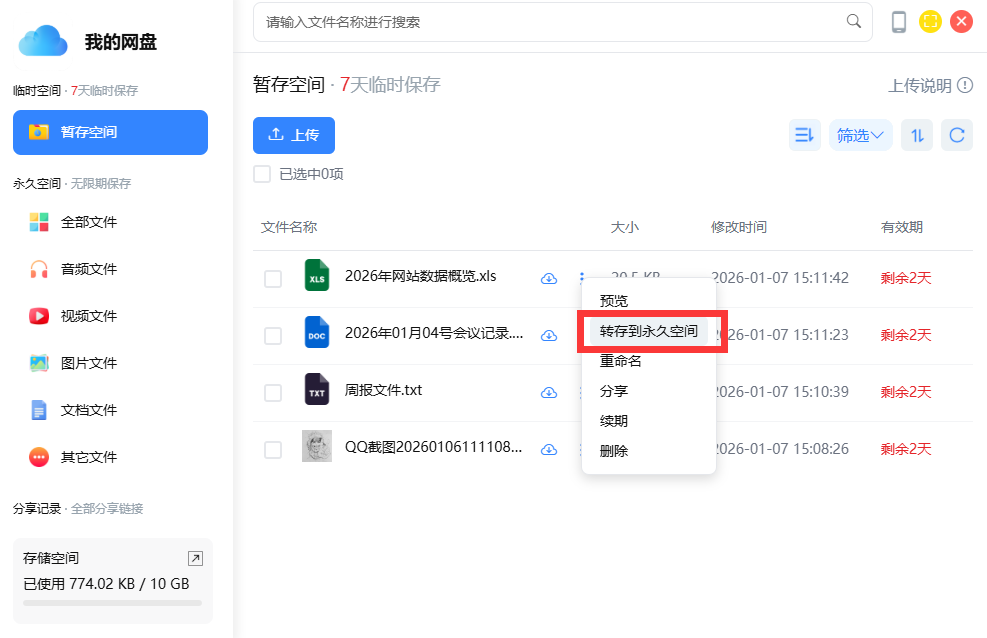 Codayun网盘强调的是临时空间,因为大部分中转文件都是临时文件,生命周期都是几个小时、几天,所以7天一过,文件不需要你清理,就自动消失。但是如果你想长期留档,也可以右键一键转入永久空间。