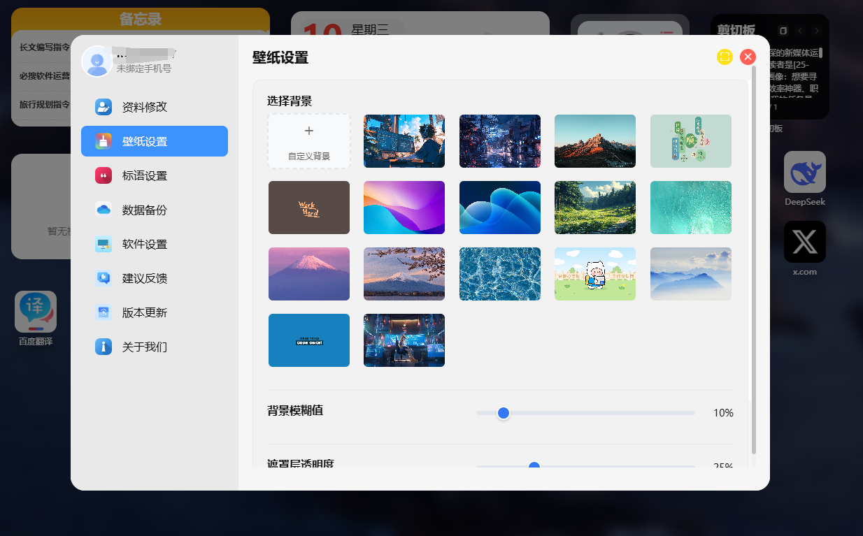 3、颜值即生产力:可以自定义背景图和标题,每天换一张高清壁纸,搭配模煳度和透明度调节,工作心情都变好了。