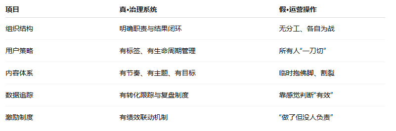 用一句话总结:先完成治理,才能进入运营。否则所有运营,都是无效忙碌。