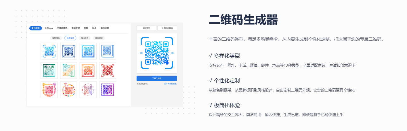 个性化定制是它的一大亮点。从二维码的颜色选择,到框架设计,再到添加品牌标识 —— 上传 logo,都能自由设置。还有添加文字、外框、码点等细节设计,多种美化模板供你挑选,比如经典样式、简约样式、黑白样式等,让你的二维码告别千篇一律,彰显独特个性,完美契合品牌风格。