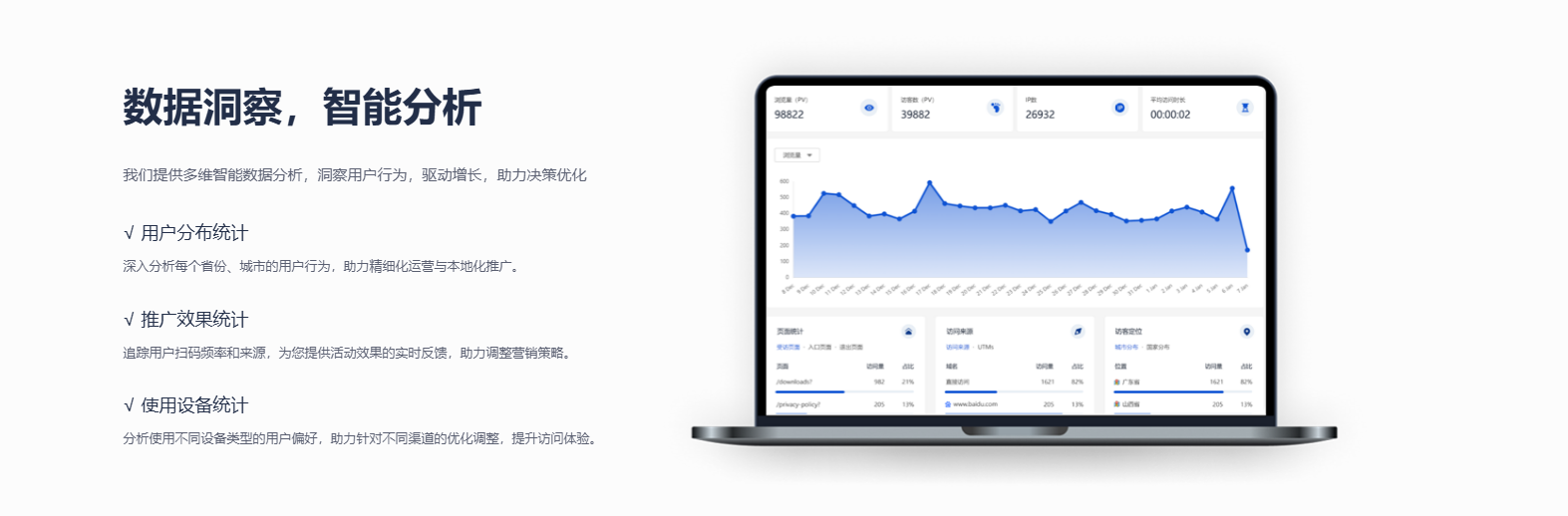 不仅如此,它还自带智能数据分析功能,这可是营销推广的得力助手。通过多维智能数据分析,能深入了解用户行为。像用户分布统计,能精确到每个省份、城市的用户行为数据,助力精细化运营与本地化推广;推广效果统计,可以追踪用户扫码频率和来源,为活动效果提供实时反馈,方便及时调整营销策略;使用设备统计,则能分析不同设备类型的用户偏好,针对不同渠道优化调整,提升用户访问体验。