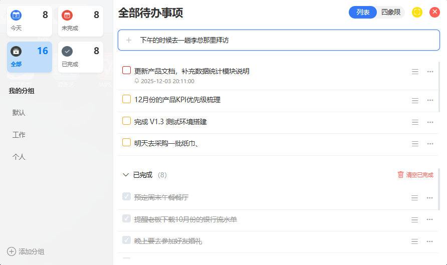 此外,待办事项清单还支持对任务进行战略性规划。在明确区分任务的轻重缓急后,不重要的工作可以灵活调整处理时间,而空余的时间可以合理利用或休息,确保你能将精力聚焦于核心目标。最终,一份有序完成的待办事项清单会让你感到非常有成就感,条理清晰地推动上级领导或个人目标的实现。