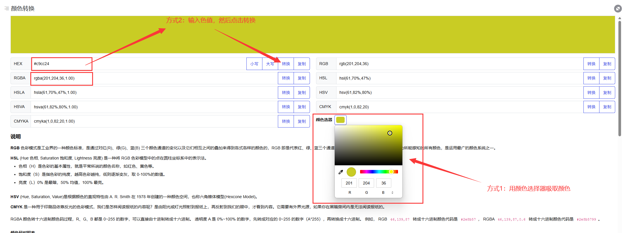 你可以用颜色选择器选择一个颜色,或者输入一个任意格式的色值,点击转换,然后就会自动生成其他几个格式,如HEX、RGB、RGBA、HSL、HSLA、HSV、HSVA、CMYK、CMYKA的色值了。非常方便。