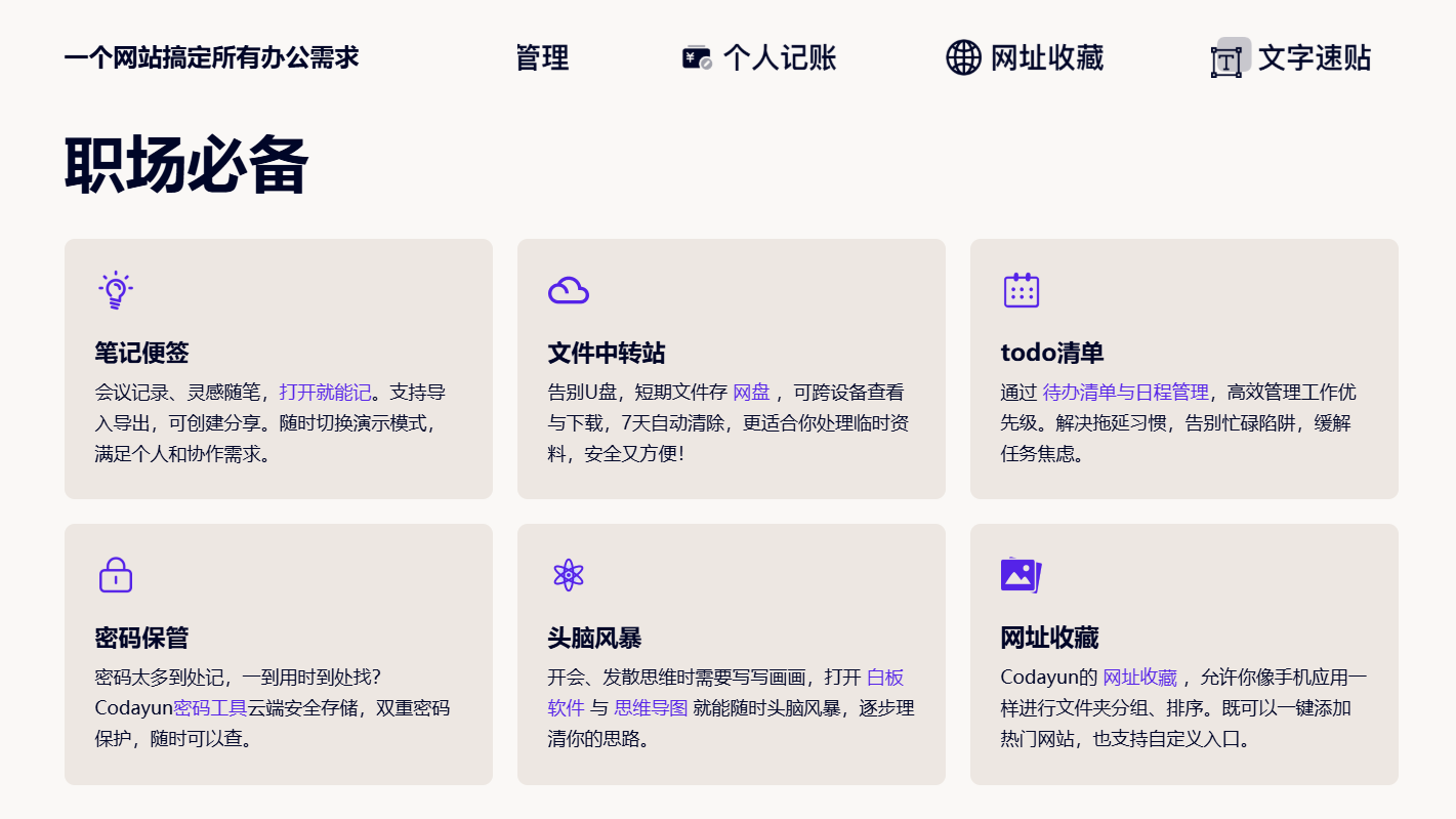今天,我想给你介绍一次“系统级”的解决方案:CodaYun。 它主张一个简单的理念:你90%的日常数字需求,根本不需要安装任何软件。 打开一个网页,你就能获得一个集成了网盘、智能备忘录、四象限待办、在线白板、思维导图、轻度PS等超过50种工具的效率百宝箱。