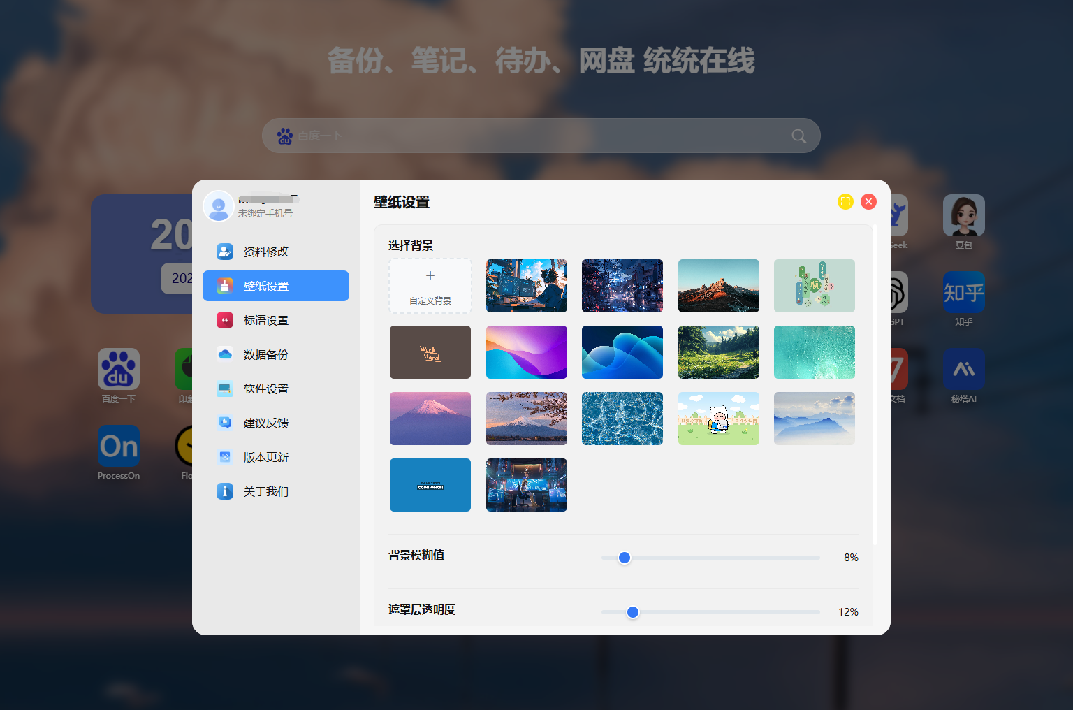 3、通过【个性化设置】,你可以更换主题、壁纸,甚至调整窗口透明度,设置激励标语