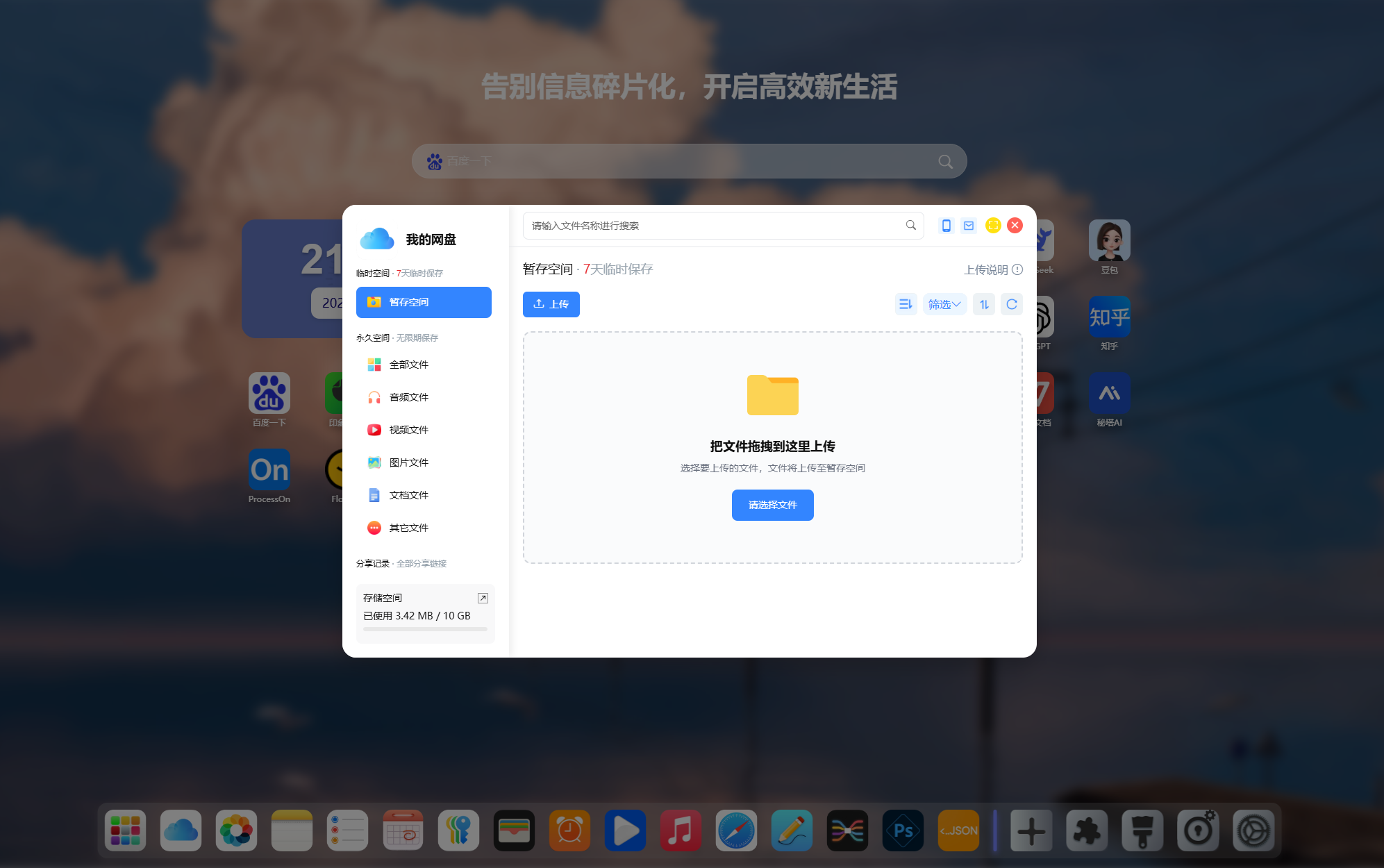 3、可以先试着把桌面的一个文件拖进「网盘」;或者打开「备忘录」写下一段当下的想法。